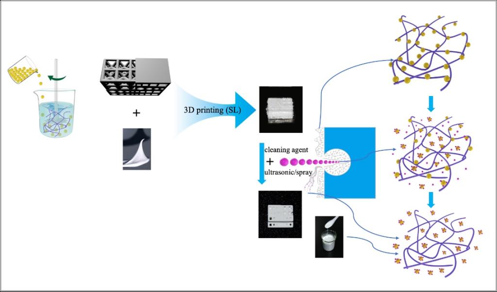 基于粘弹膏体的陶瓷立体光刻3D打印坯体清洗机制示意图