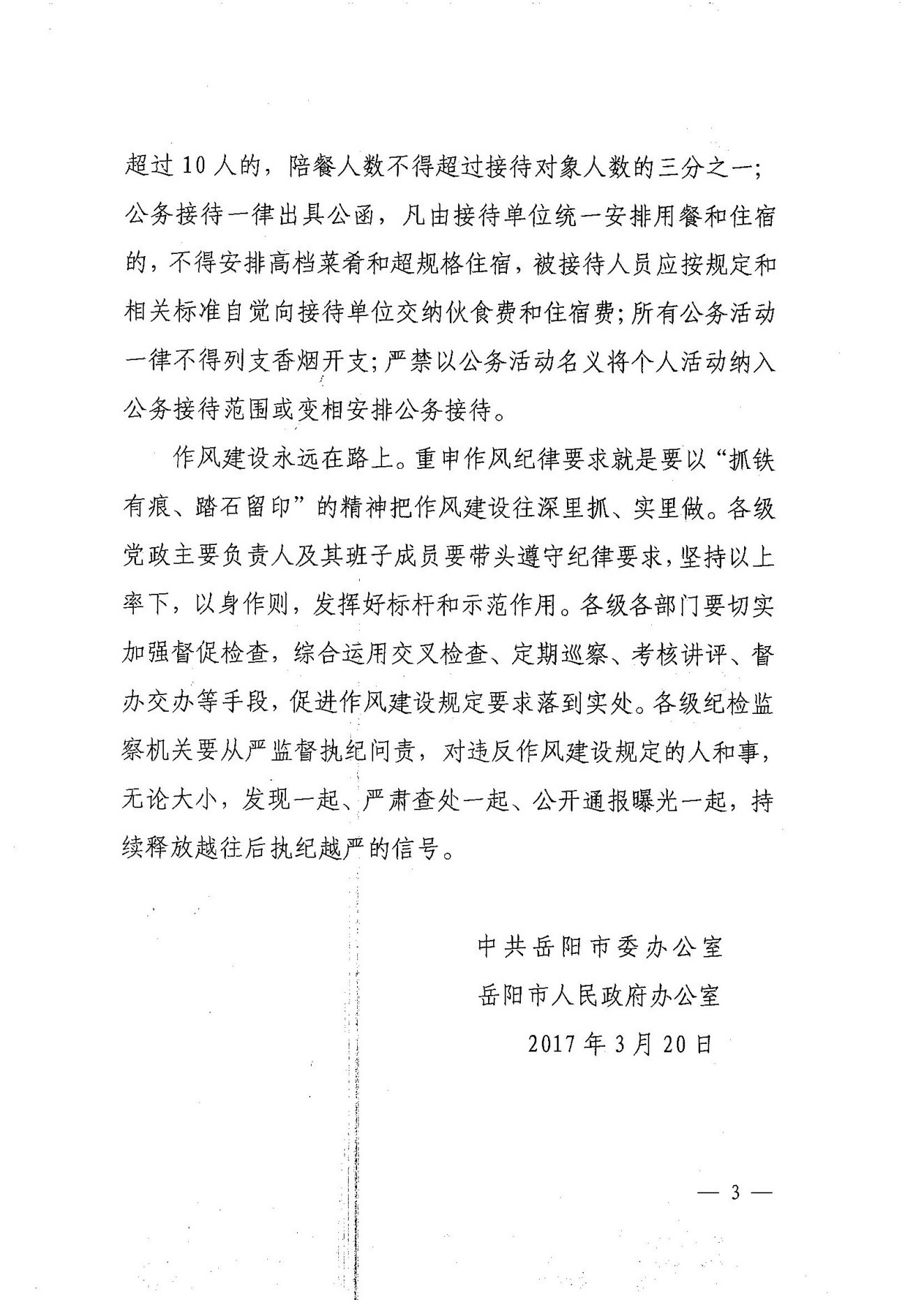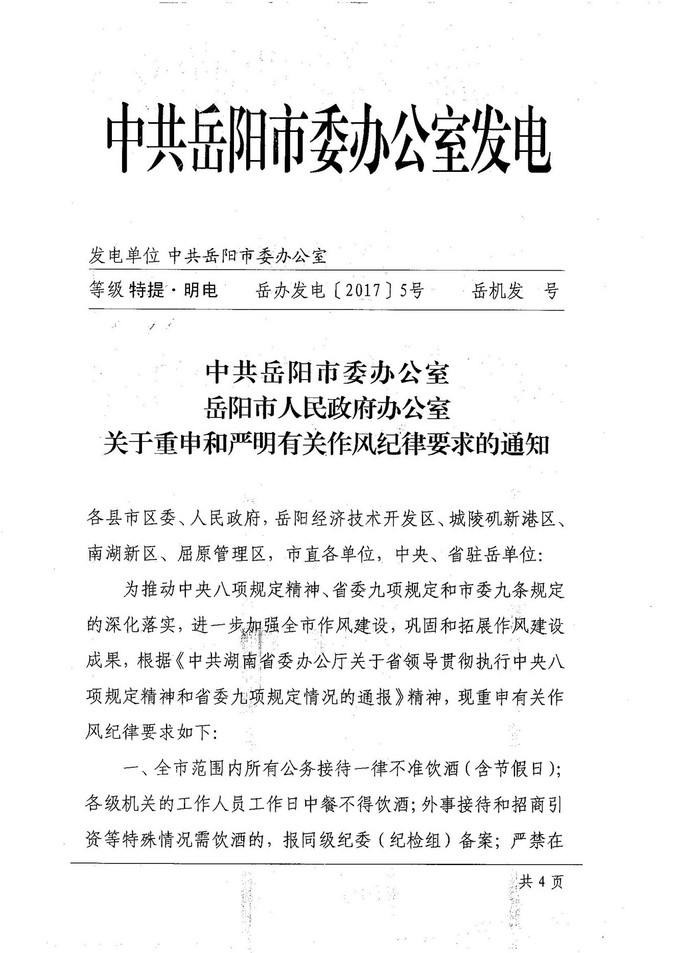 现将《中共岳阳市委办公室 岳阳市人民政府办公室 关于重申和严明有关作风纪律要求的通知》(岳办发电〔2017〕5号)转发给你们,请认真组织学习,并遵照执行。