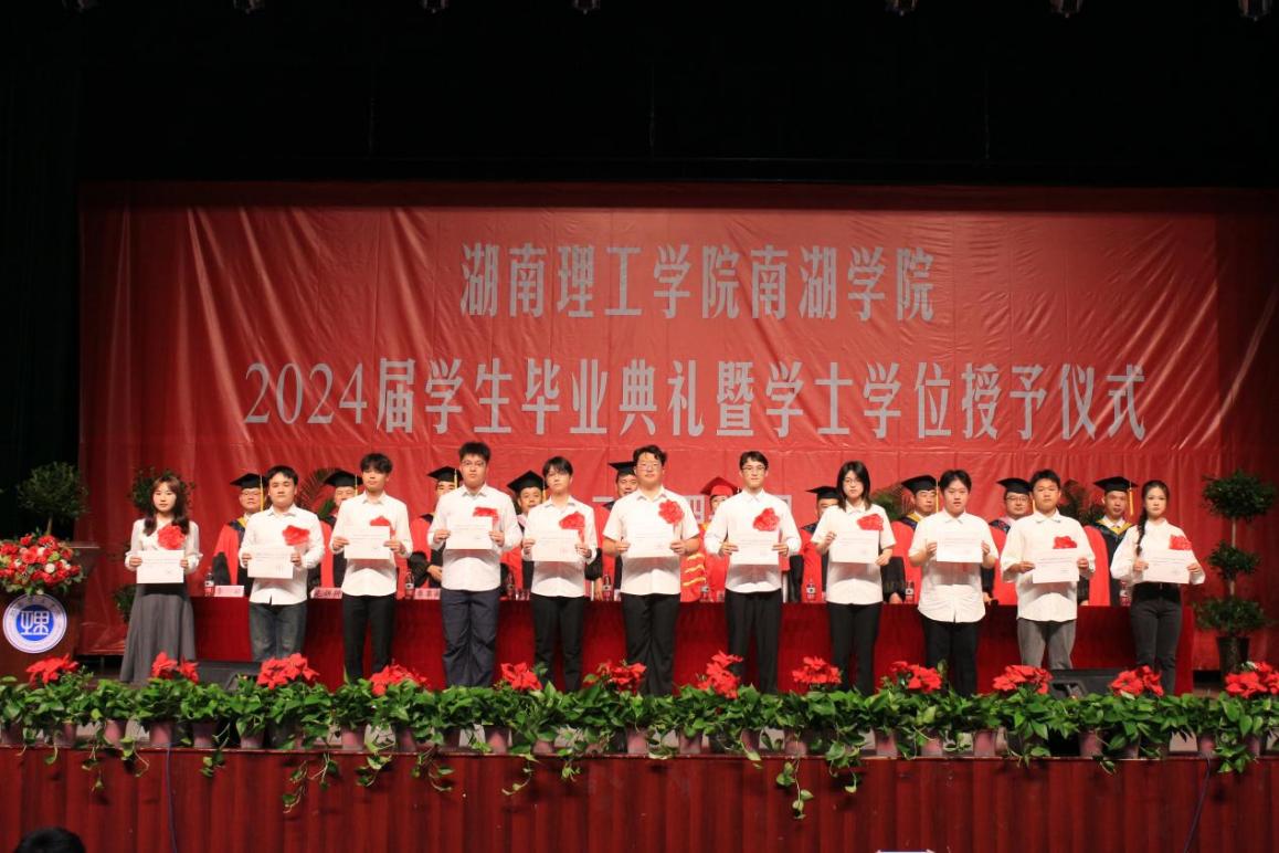 毕业典礼在庄严的国歌声中拉开帷幕。院党委书记柳周峰宣读《关于表彰best365足球官网南湖学院2024届校友分会理事会的通知》,副院长蔡安辉宣读《best365足球官网南湖学院关于2024届本科生准予毕业与授予学士学位的决定》,副院长胥望宣读《关于成立best365足球官网南湖学院2024届校友分会理事会的通知》。随后举行了颁奖仪式,学院领导为获奖学生代表颁发了荣誉证书。